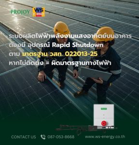 บทความและข่าวสาร บทความ และ ความรู้ รู้หรือไม่? ระบบโซลาร์บนอาคาร จำเป็นต้องมีอุปกรณ์ Rapid Shutdown Rapid Shutdown คืออะ Read More » 19 ธันวาคม 2025 ไม่มีความเห็น ข่าวสาร Training On-site @ THAI YAMAHA 🏭 Training On-site @ Read More » 9 ตุลาคม 2025 ไม่มีความเห็น ข่าวสาร ขอบคุณผู้เข้าร่วมอบรมหลักสูตร PROJOY x WS ENERGY เดือนกันยายน 2568 🌞 ขอบคุณผู้เข้าร่วมอ Read More » 9 ตุลาคม 2025 ไม่มีความเห็น ข่าวสาร ASEAN Sustainable Energy Week 2025 ขอบคุณทุกท่านที่ให้เ Read More » 9 ตุลาคม 2025 ไม่มีความเห็น บทความ และ ความรู้ พลังงานแสงอาทิตย์สู่ชุมชน พลังงานแสงอาทิตย์สู่ Read More » 9 ตุลาคม 2025 ไม่มีความเห็น บทความ และ ความรู้ โซลาร์ภาคประชาชน 1,500 เมกะวัตต์ โซลาร์ภาคประชาชน 1,5 Read More » 9 ตุลาคม 2025 ไม่มีความเห็น
